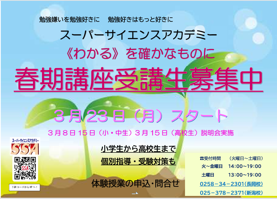 長岡校 春期講座 体験会・説明会のご案内 お申込みはお電話で 0258-34-2302